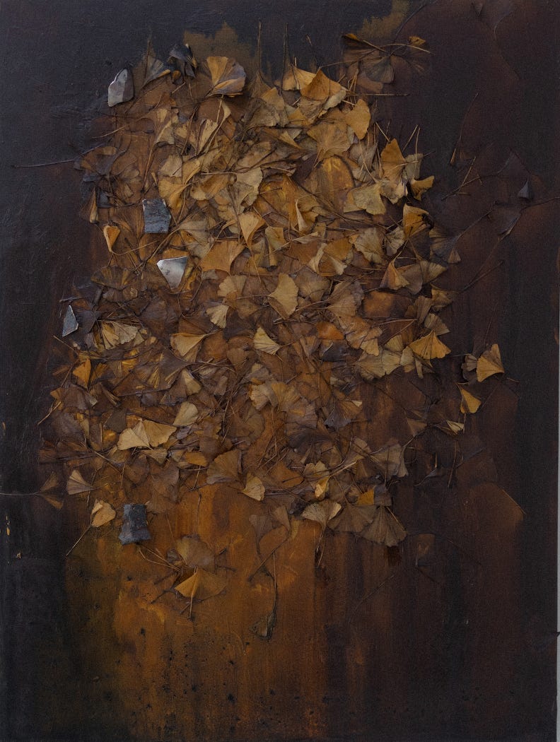 Gingko leaves, saggar fired porcelain, copper wire, plaster, oil on wood 48 x 36 in (121.9 x 91.4 cm)